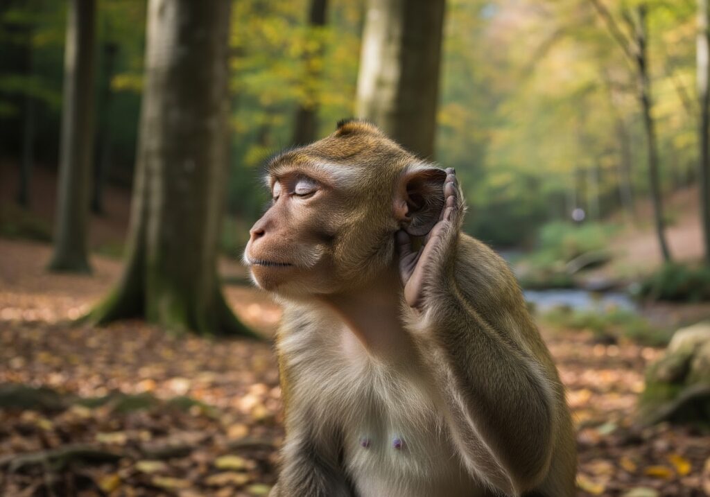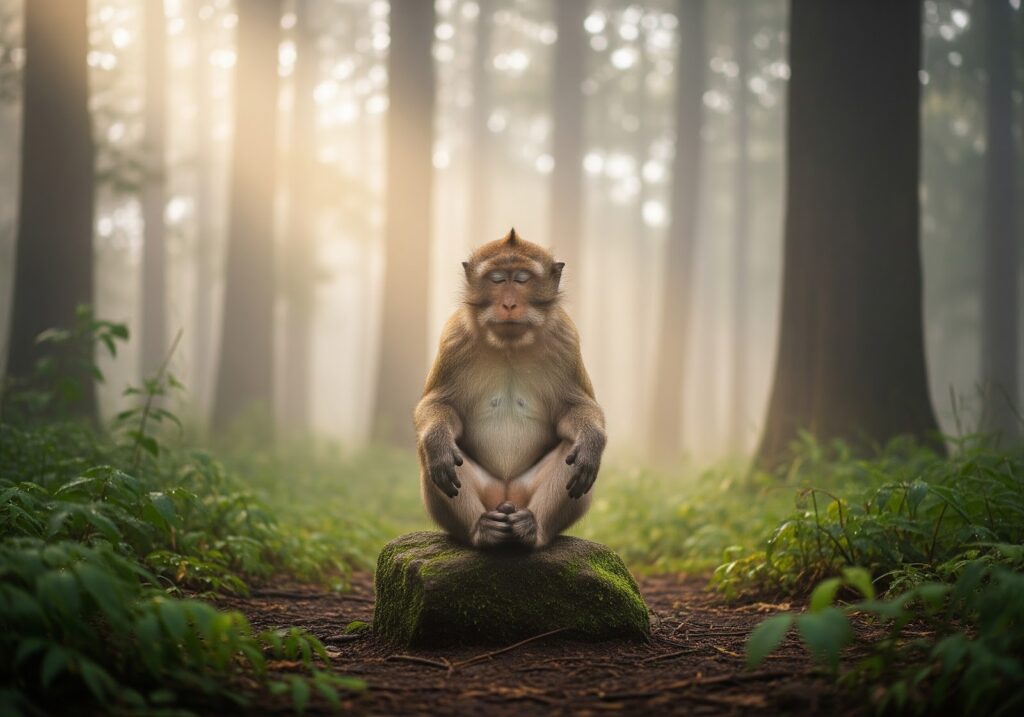 霧の立つ朝、森の中で一匹のさるが、小さな石の上に腰をおろしていました。