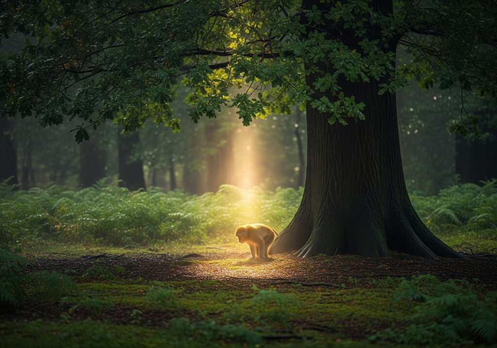 その中で、オークの樹が金色の光をひとすじ、さるの足もとに落としました。
