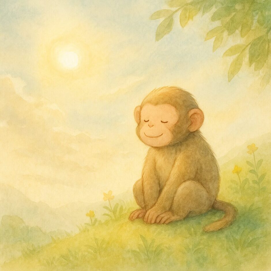 霧の立つ朝、森の中で一匹のさるが、小さな石の上に腰をおろしていました。