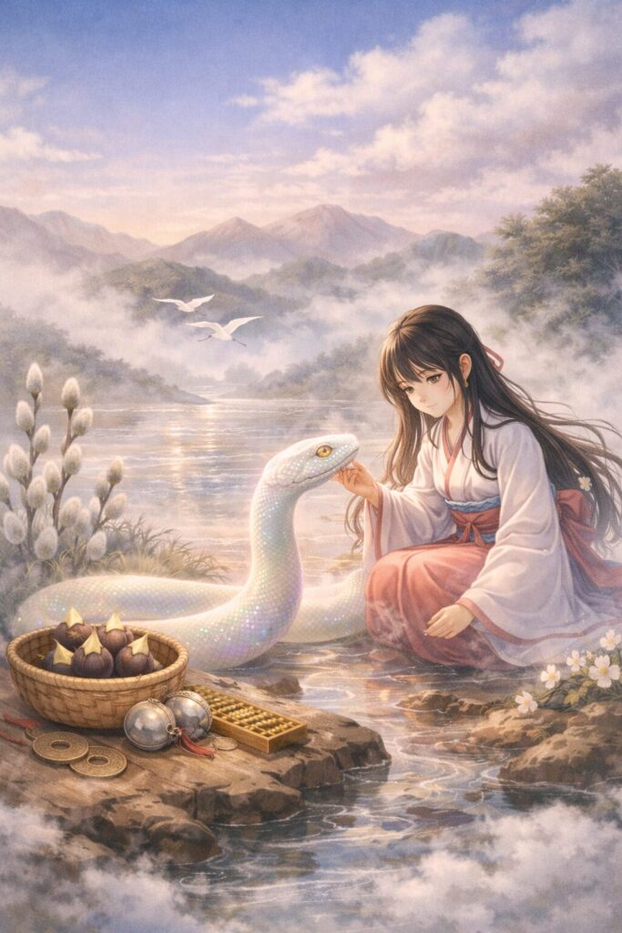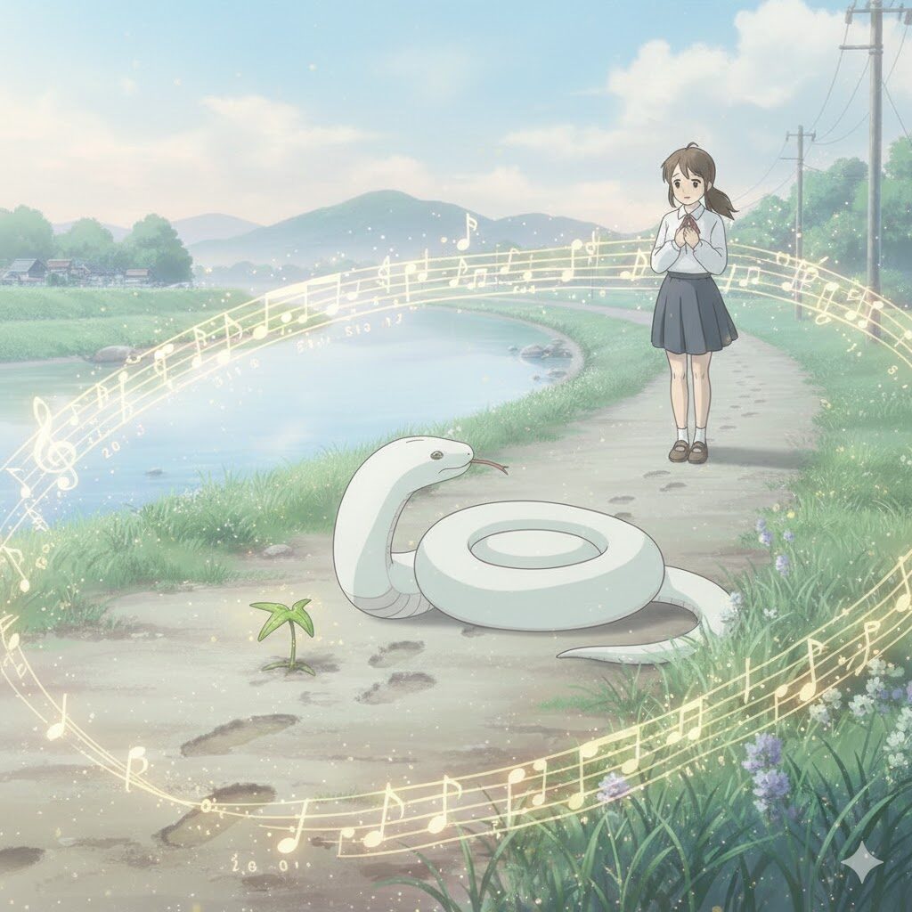 白い巳は、くるりと体を巻き、
