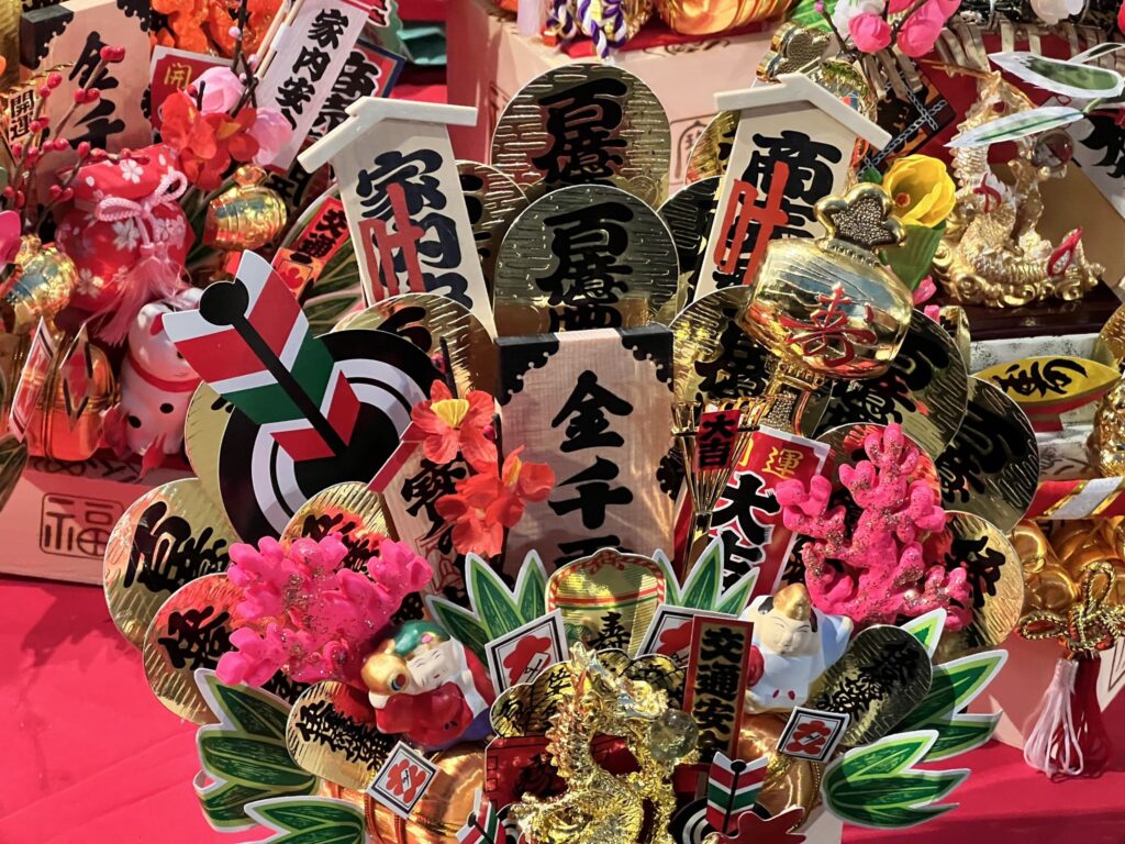 米俵(豊かさ)、小槌(願望成就)、小判(財運)、鯛(めでたい)、