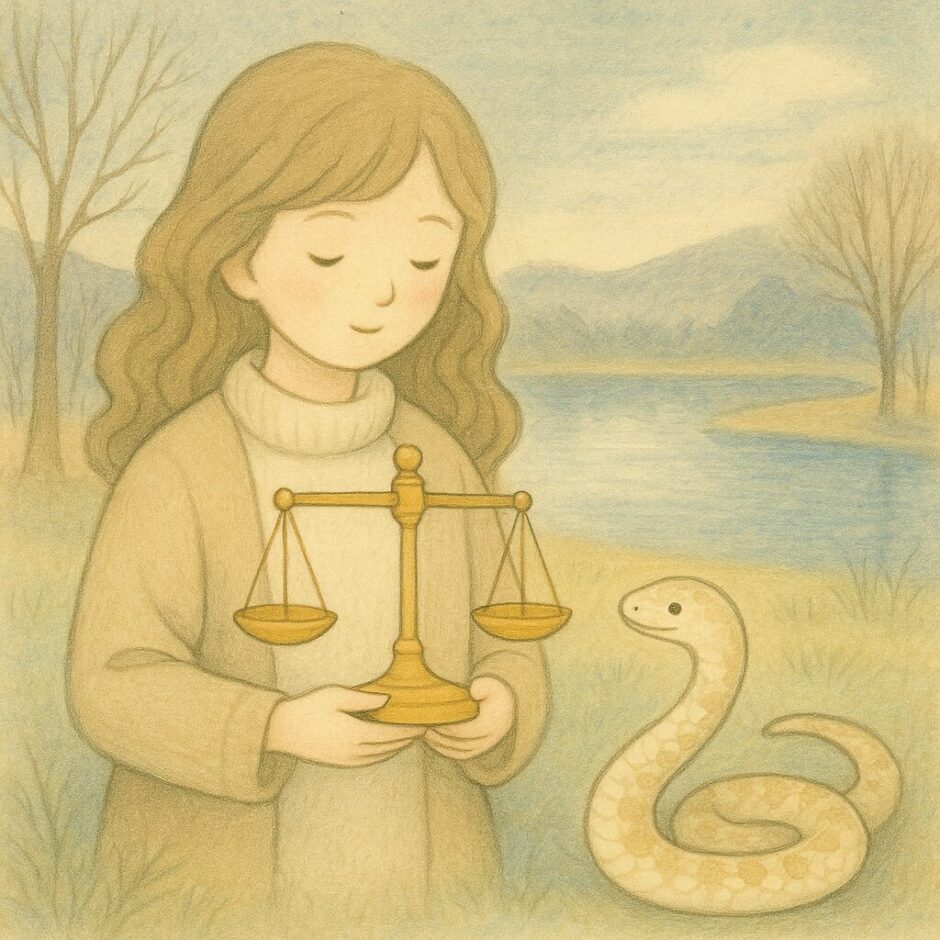 ある日、少女は天びんを持って湖のほとりへ行きました。