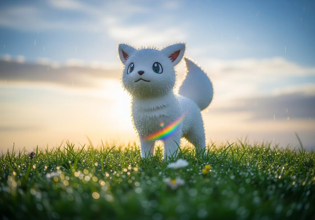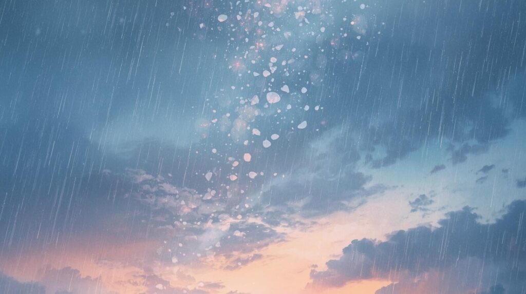 雨のしずくが光の粒になって、空へ舞い上がっていきます。