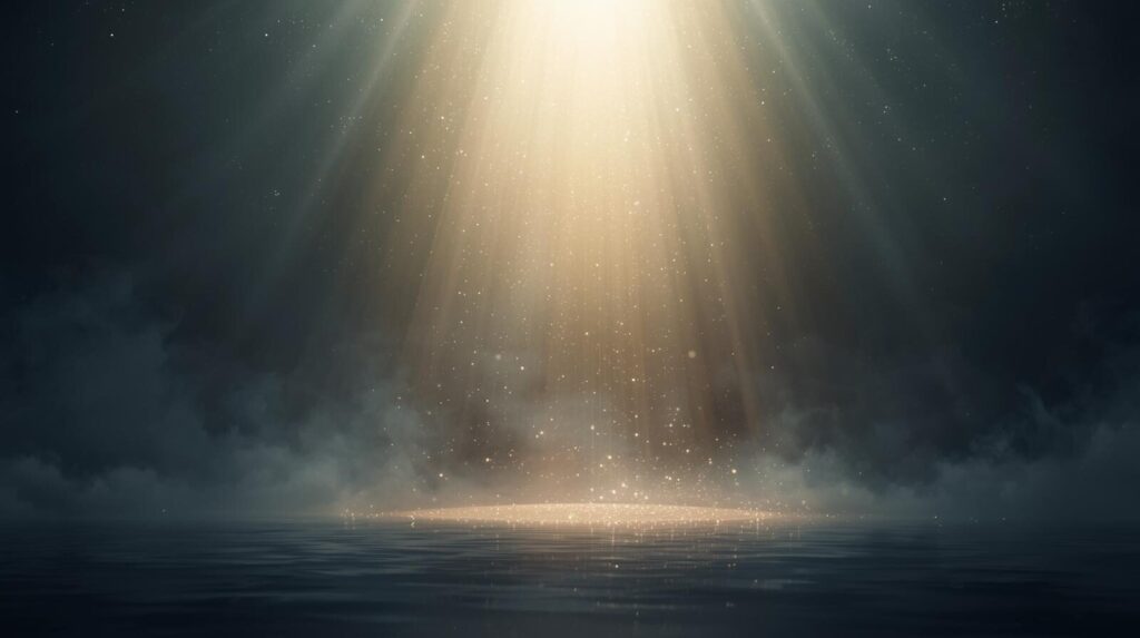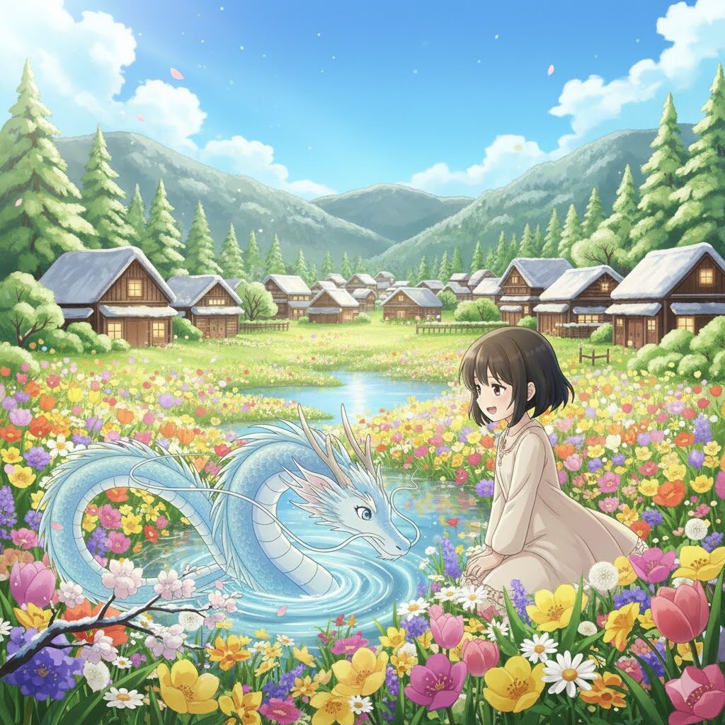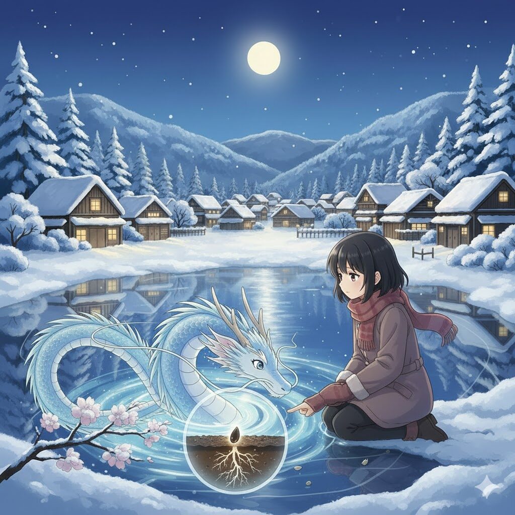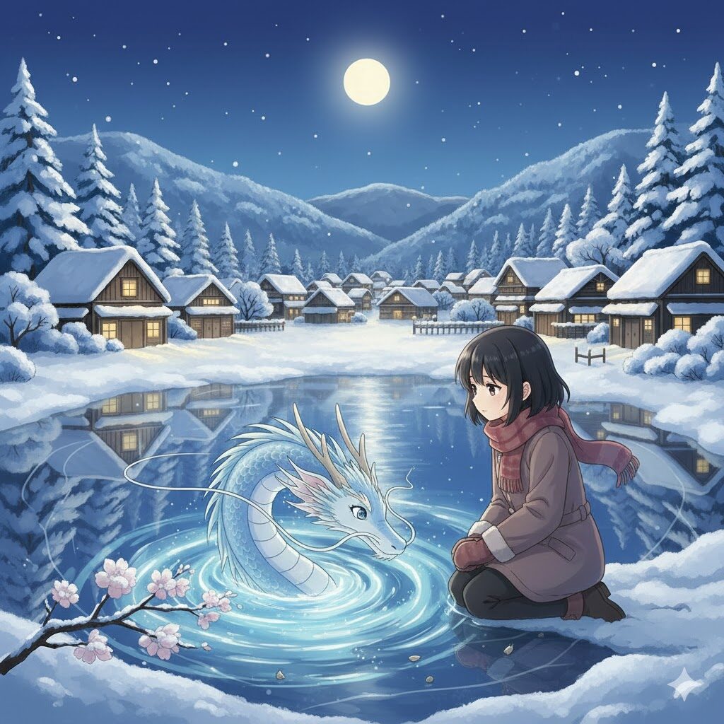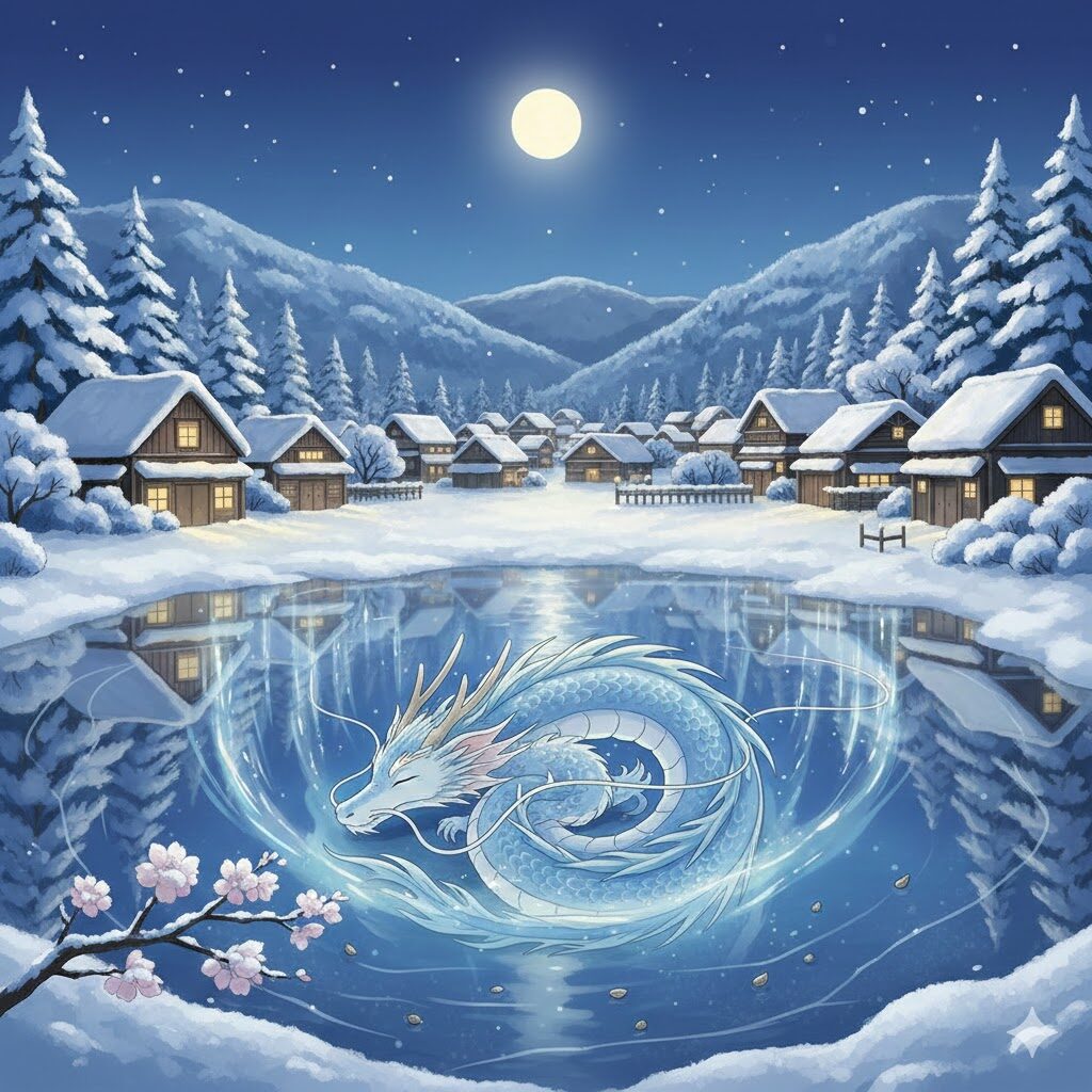 湖の中から青くやさしく光るリュウが顔を出しました。