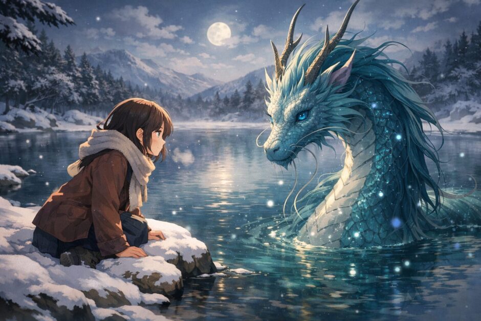 湖の中から青くやさしく光るリュウが顔を出しました。