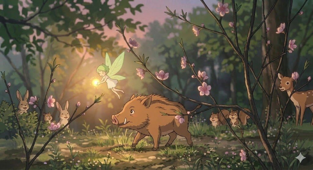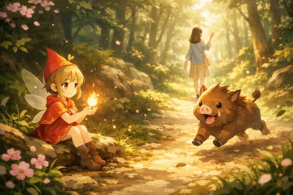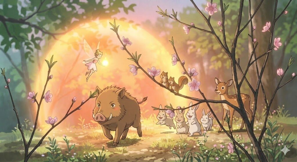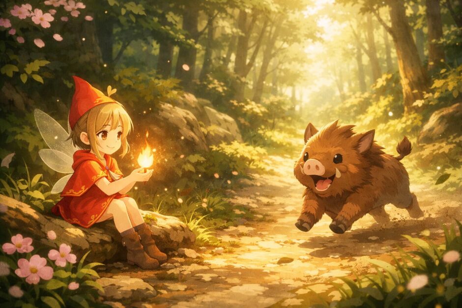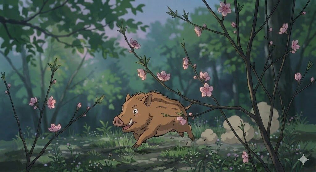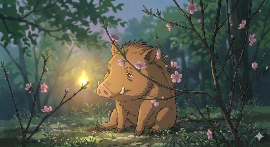 「灯りの火と、まっすぐ進むいのしし」